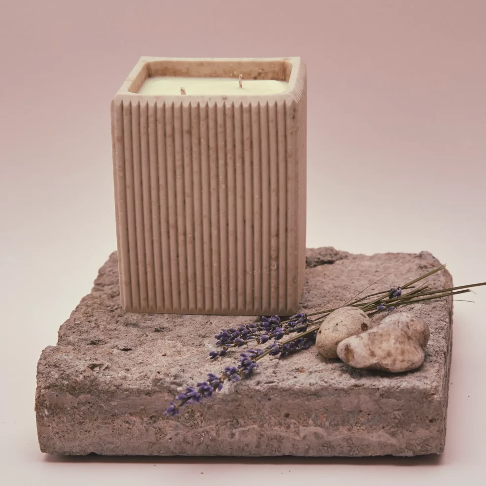 Scented candle infused with gentle notes of lavender blossom flower, evoking a Mediterranean lifestyle. Comes in a bio-ceramic squared vessel, made with orange peels and other organic mater...