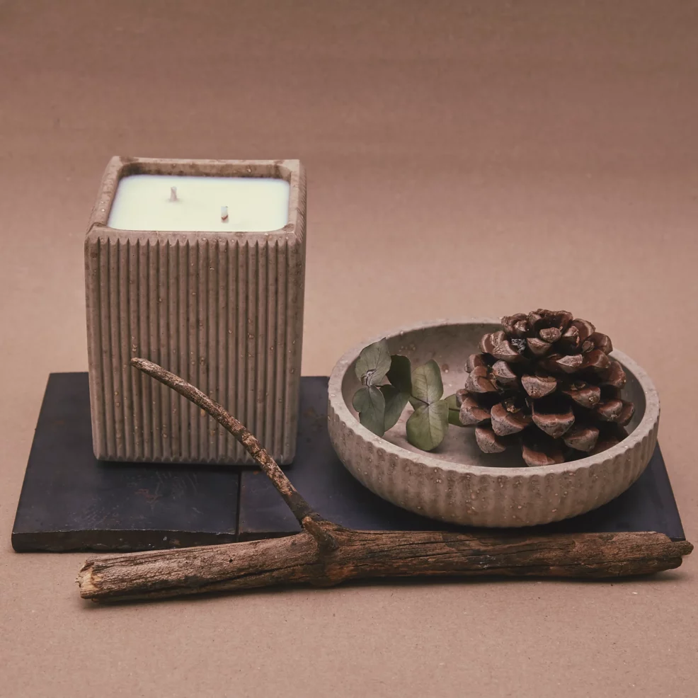 Pack of Quadrat candle infused with a blend of earthy cederwood and Tibetean musk notes, combined with our signature Font bowl. Bio-ceramic made with orange peels and other organic material...